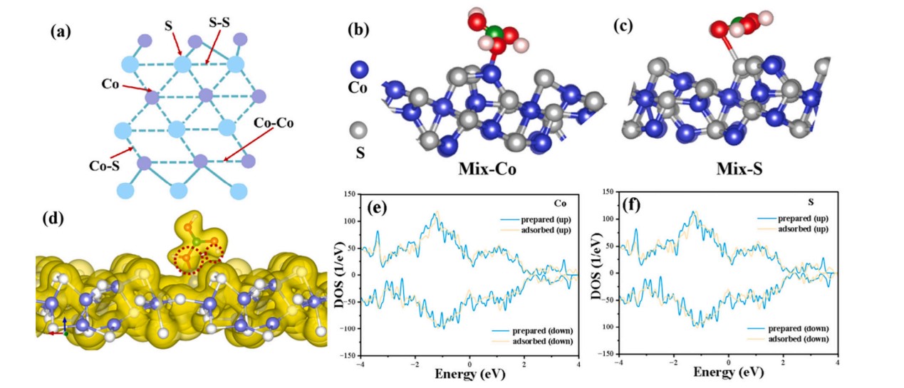 圖2.(a)ZIF-67衍生Co3S4中空吸附劑的吸附位點(diǎn)示意圖;(b-c)H3BO3在Co?S?上最穩(wěn)定的結(jié)構(gòu)(Co和S位點(diǎn));(e,f)不同位點(diǎn)Co?S?吸附H3BO3的DOS圖。